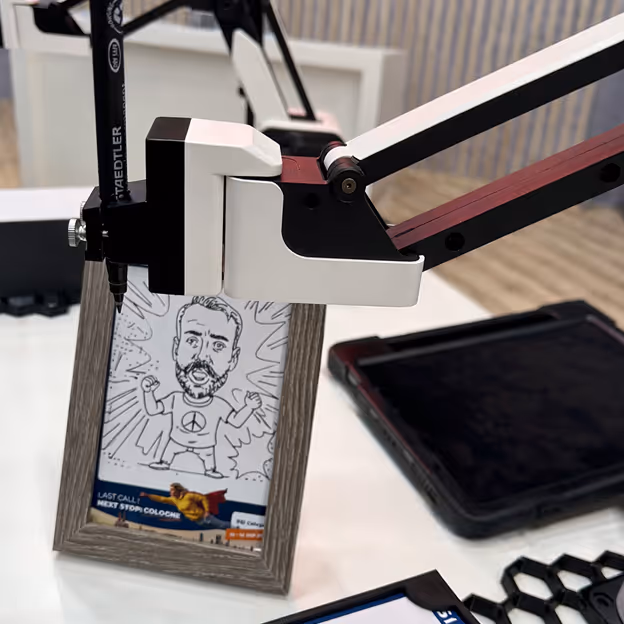 Der AI Picasso erstellt aus einem Foto in kurzer Zeit eine individuelle Sketch-Illustration. Gäste stellen sich kurz vor die Kamera, das Bild wird aufgenommen und anschließend von der KI in eine detaillierte Zeichnung verwandelt. Der Roboterarm setzt den Sketch danach live um – in etwa 1–2 Minuten entsteht so eine einzigartige Zeichnung